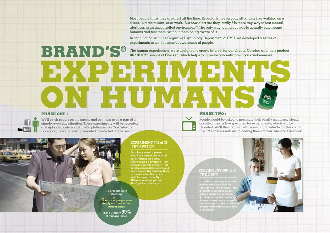 Our team conducted an experiment in the bustling business district, challenging the public's alertness by swapping the person they were conversing with mid-dialogue. This exercise demonstrated that many individuals aren't as observant as they believe. To highlight the importance of mental sharpness, each participant was rewarded with a bottle of Brand's Essence of Chicken at the conclusion of the test.